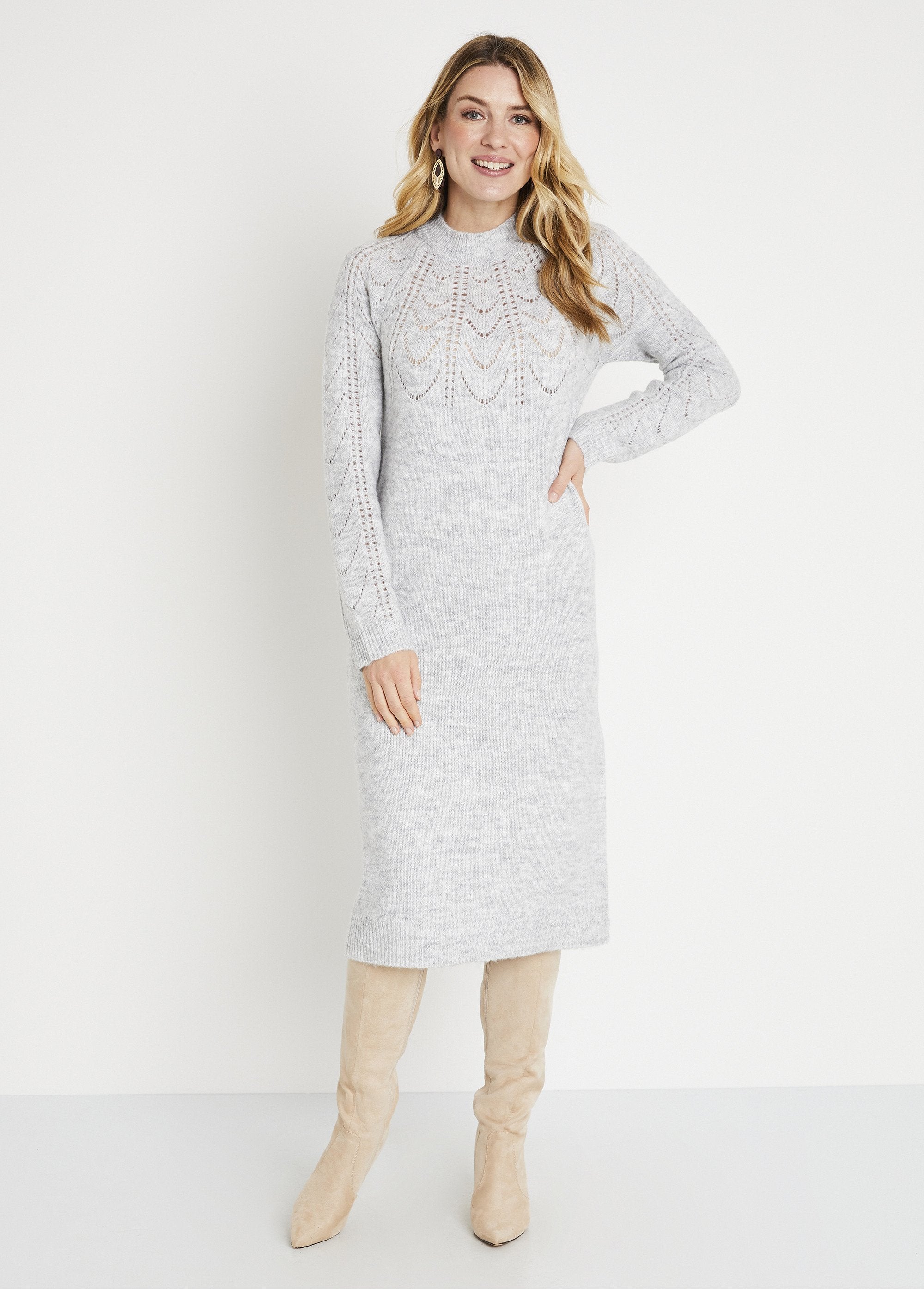 The jersey sweater dress features an openwork pattern under the front/back neckline and along the long sleeves, highlighted by raglan volume. To modernize the look, a wide rib trim highlights the round collar, cuffs and hem.