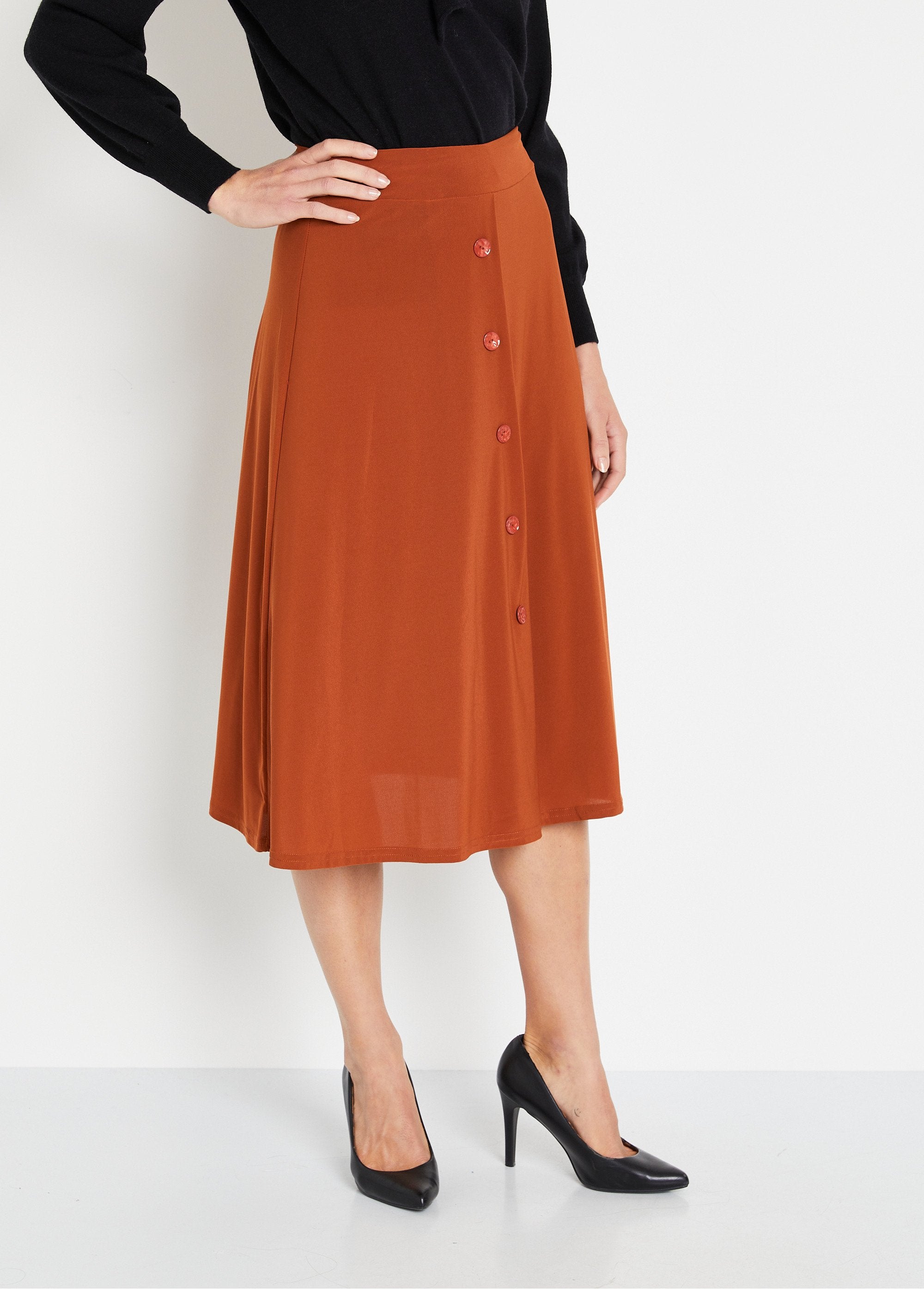 Made in France, the long flared skirt combines charm and comfort with its wide, flat, fully elasticated waistband and fancy button front (faux buttoning).