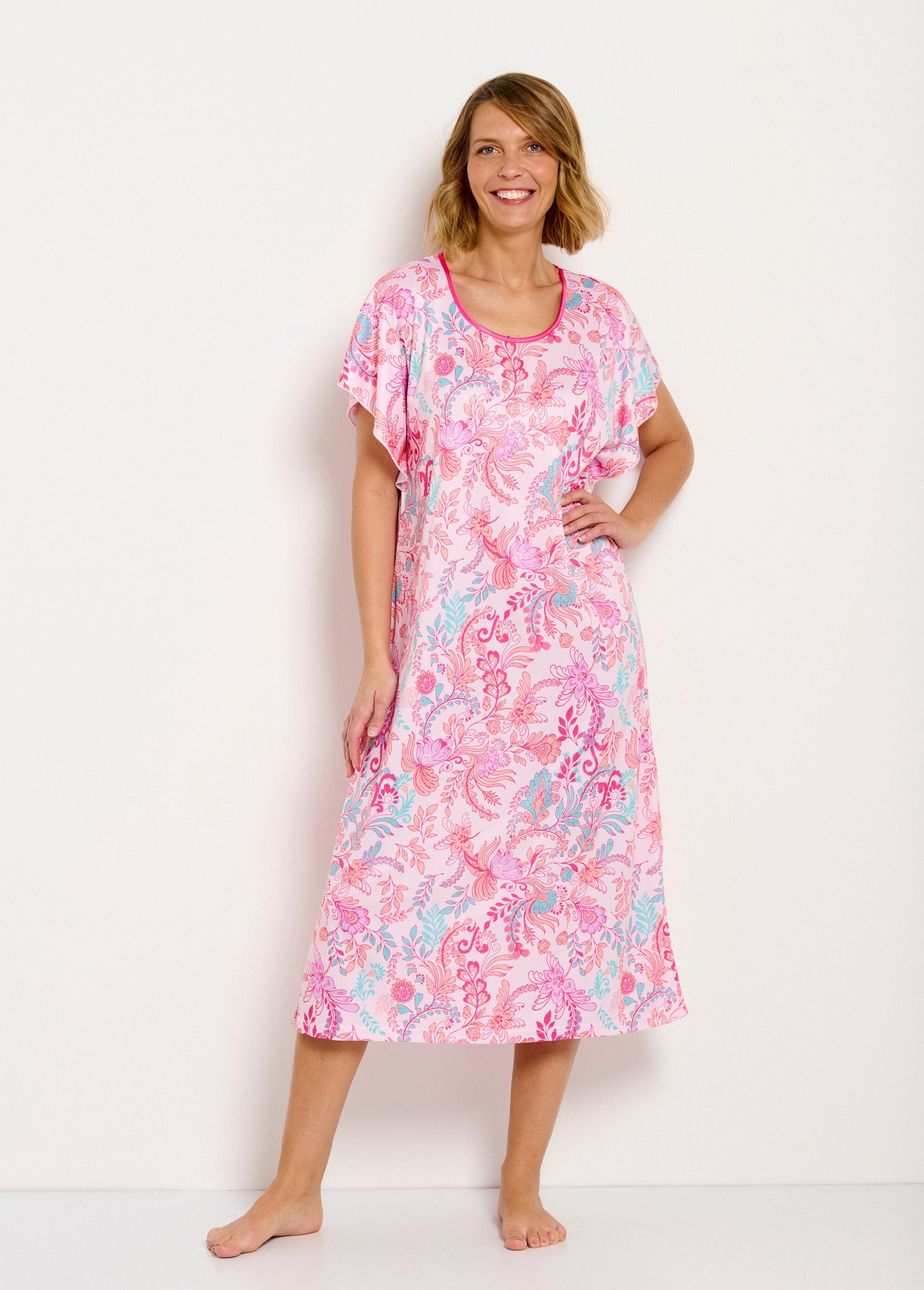 Harmonious floral print, long and loose fit... The hostess dress accompanies you every day with all femininity. Beautiful fullness of the bias-finished butterfly sleeves. Round neckline with contrasting bias. Straight hem.