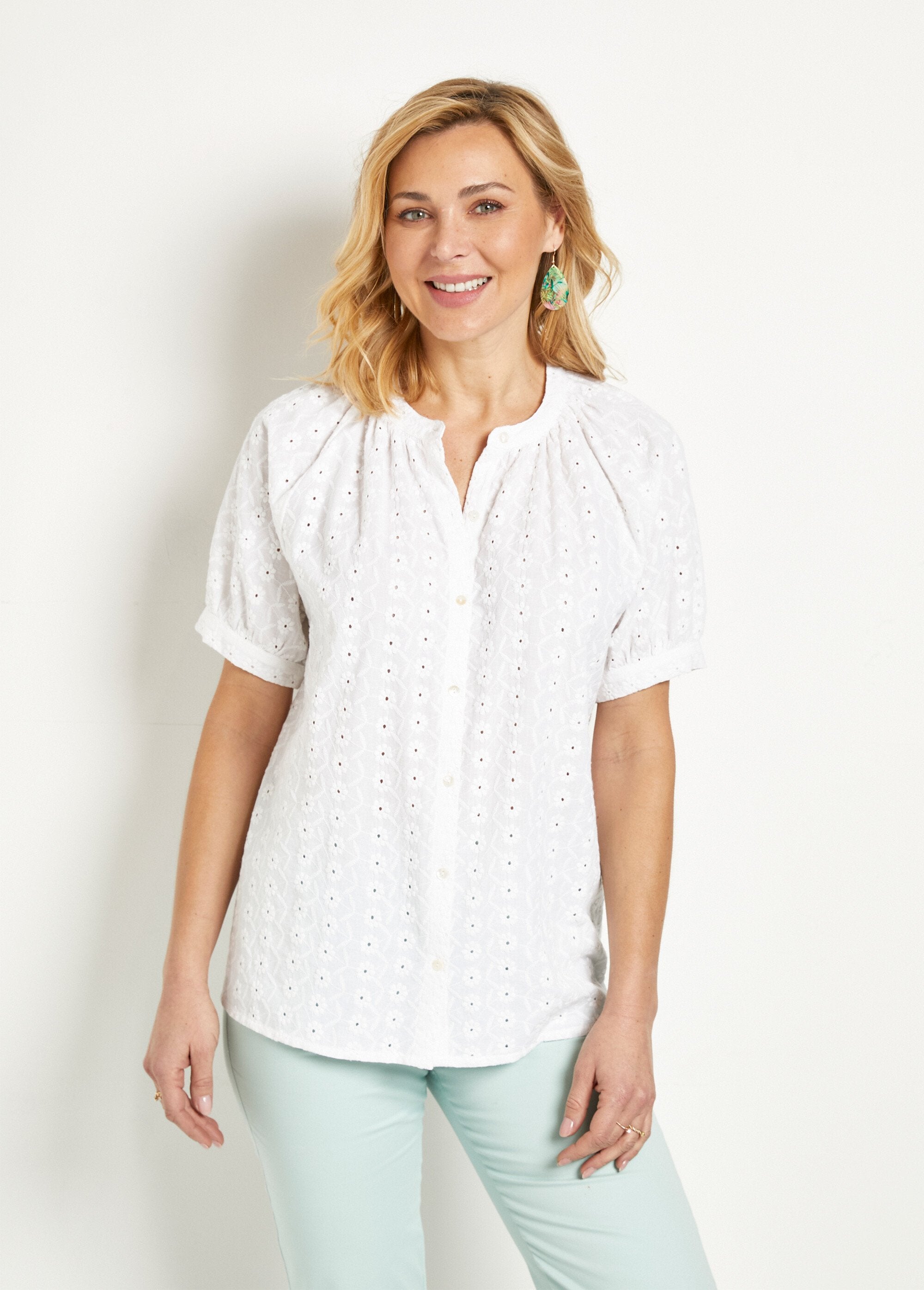 Mooi vrouwelijk volume, ton sur ton borduursel voor een totale look... De zomerblouse krijgt een make-over. Hier zie je de details die het verschil maken: plooitjes onder de ronde hals aan de voor- en achterkant voor een zachte volheid, raglan armsgaten die de buste benadrukken en een elastische afwerking onderaan de korte mouwen voor een licht opgeblazen volume. Knoopsluiting. Rechte basis.