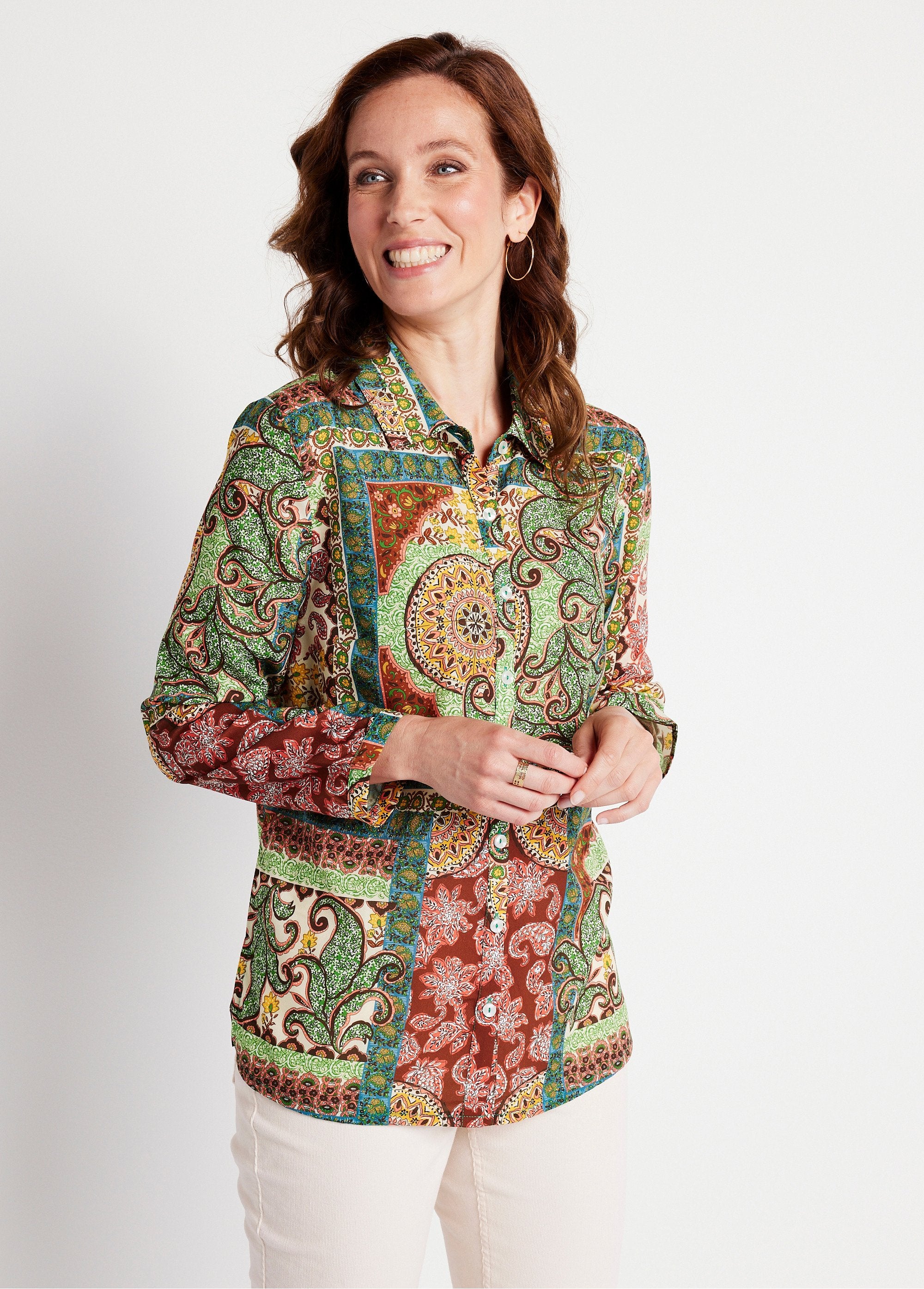 Met zijn trendy sjaalprint is deze blouse een echte stijlwinnaar! Puntkraag op opstaande kraag. Knoopsluiting. Lange mouwen die vastzitten in een bandje. Rechte zoom. Doorgestikte afwerking.