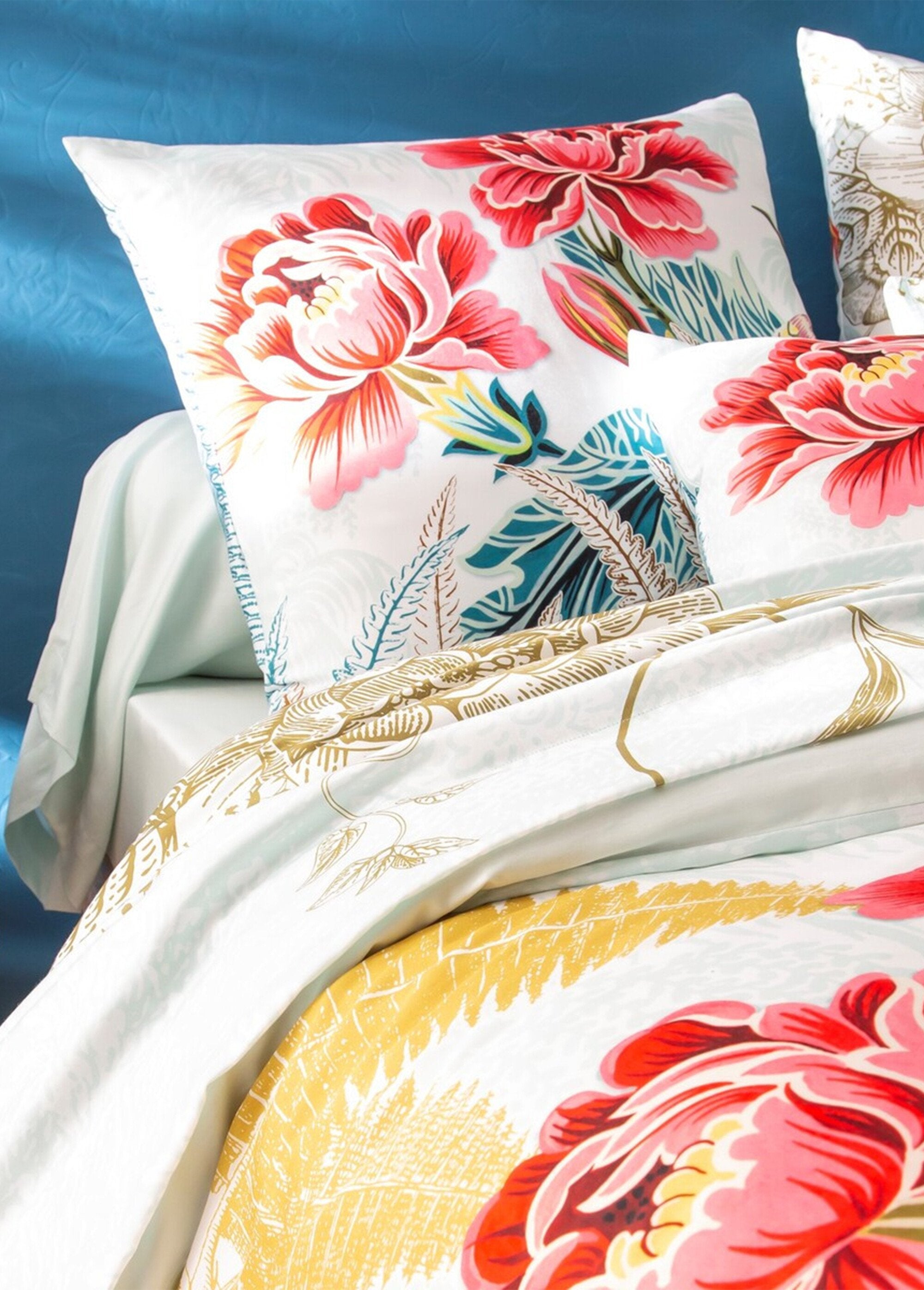 Deze Lyrique-set is zowel onmisbaar voor elke dag als een echte decoratieve aanwinst. De exotische bladeren, bloemen en vogels van elders in eigentijdse, trendy kleuren zullen je de adem benemen. Het is gemaakt van katoensatijn en zal je de hele nacht omhullen met zachtheid. Wij zijn dol op de wilde, glinsterende print. Een echte uitnodiging om op reis te gaan en er even helemaal tussenuit te zijn in buitengewone tuinen! Weefsel Het strakke weefsel (120 draden/cm2) geeft het een zeldzame sterkte. Afwerking Het hoeslaken Lyrique is verkrijgbaar voor een- of tweepersoonsbedden. Afmetingen: 90x190 cm, 140x190 cm, 160x200 cm, 180x200 en 200x200 cm.