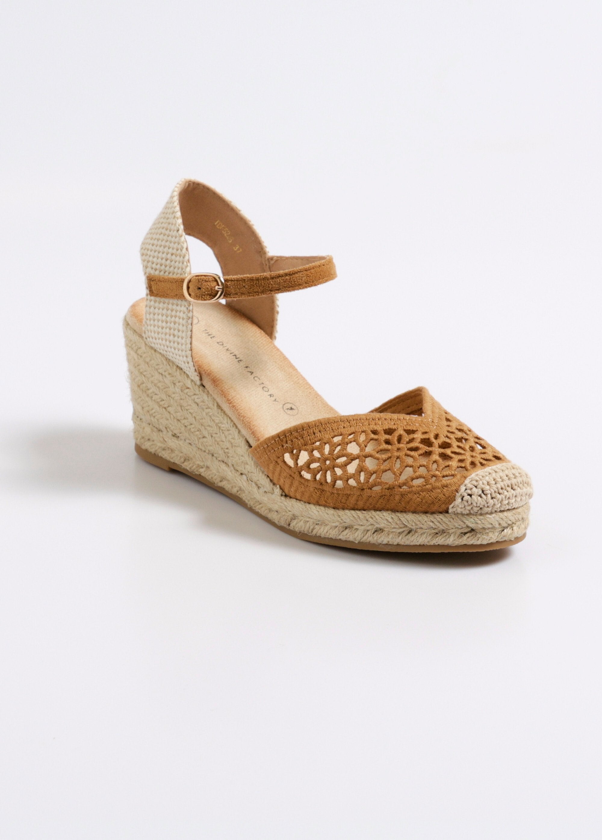 Opengewerkte sleehakken met bloemen  Camel