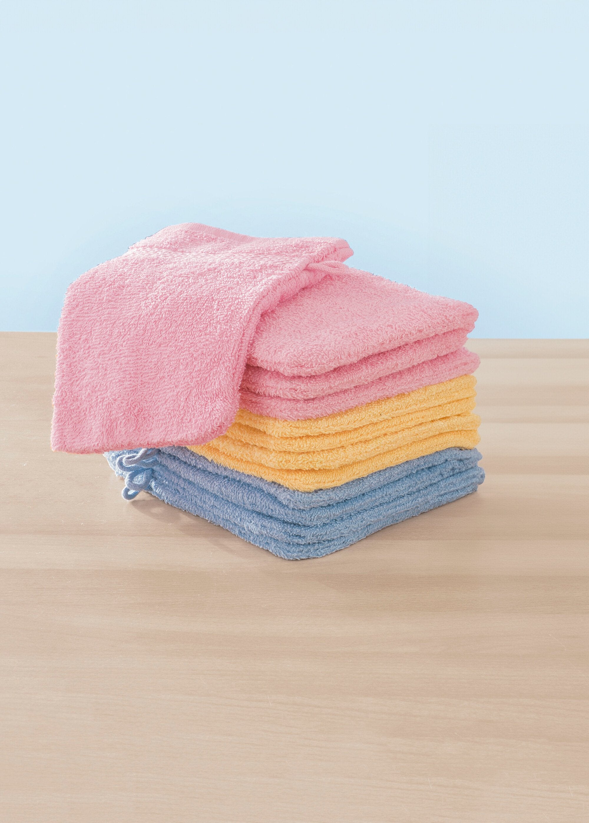 Effen of jacquard, dit pakket van 12 handschoenen in verschillende kleuren is perfect om je sponsassortiment compleet te maken of te vernieuwen. Ophangkoord voor effen kleuren. Afm. 15 x 21 cm ca. 60°C wasbaar. Puur katoen (360 g/m²). ®® Dit product is OEKO-TEX STANDARD 100 gecertificeerd door OEKO-TEX (N° 1604019 CENTEXBEL).