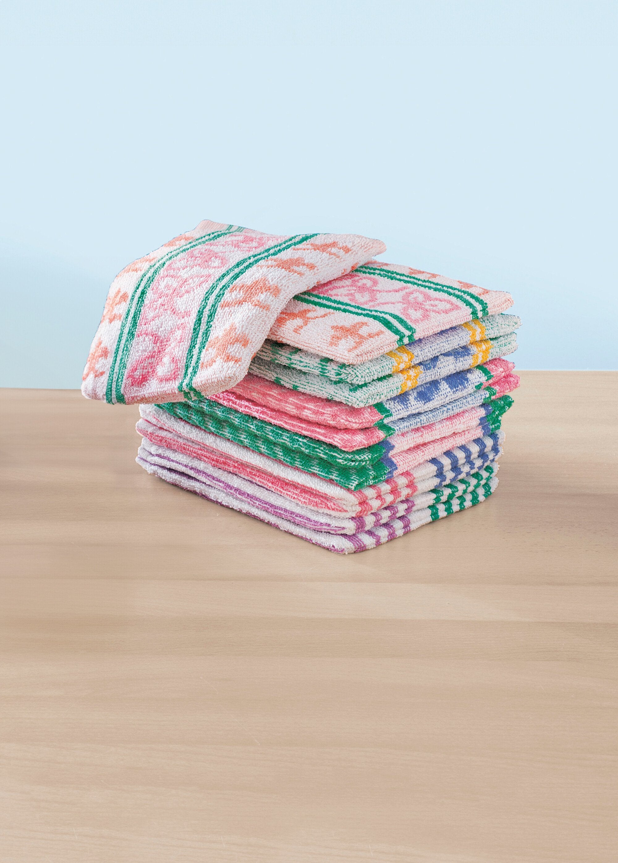 Effen of jacquard, dit pakket van 12 handschoenen in verschillende kleuren is perfect om je sponsassortiment compleet te maken of te vernieuwen. Ophangkoord voor effen kleuren. Afm. 15 x 21 cm ca. 60°C wasbaar. Puur katoen (360 g/m²). ®® Dit product is OEKO-TEX STANDARD 100 gecertificeerd door OEKO-TEX (N° 1604019 CENTEXBEL).