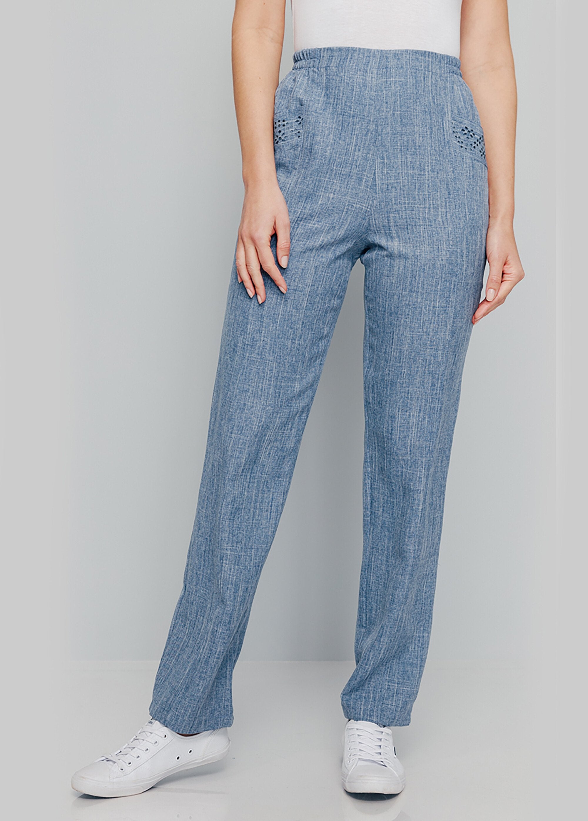 Damesbroek die het comfort van een platte buiksnit combineert met de charme van opengewerkte details.