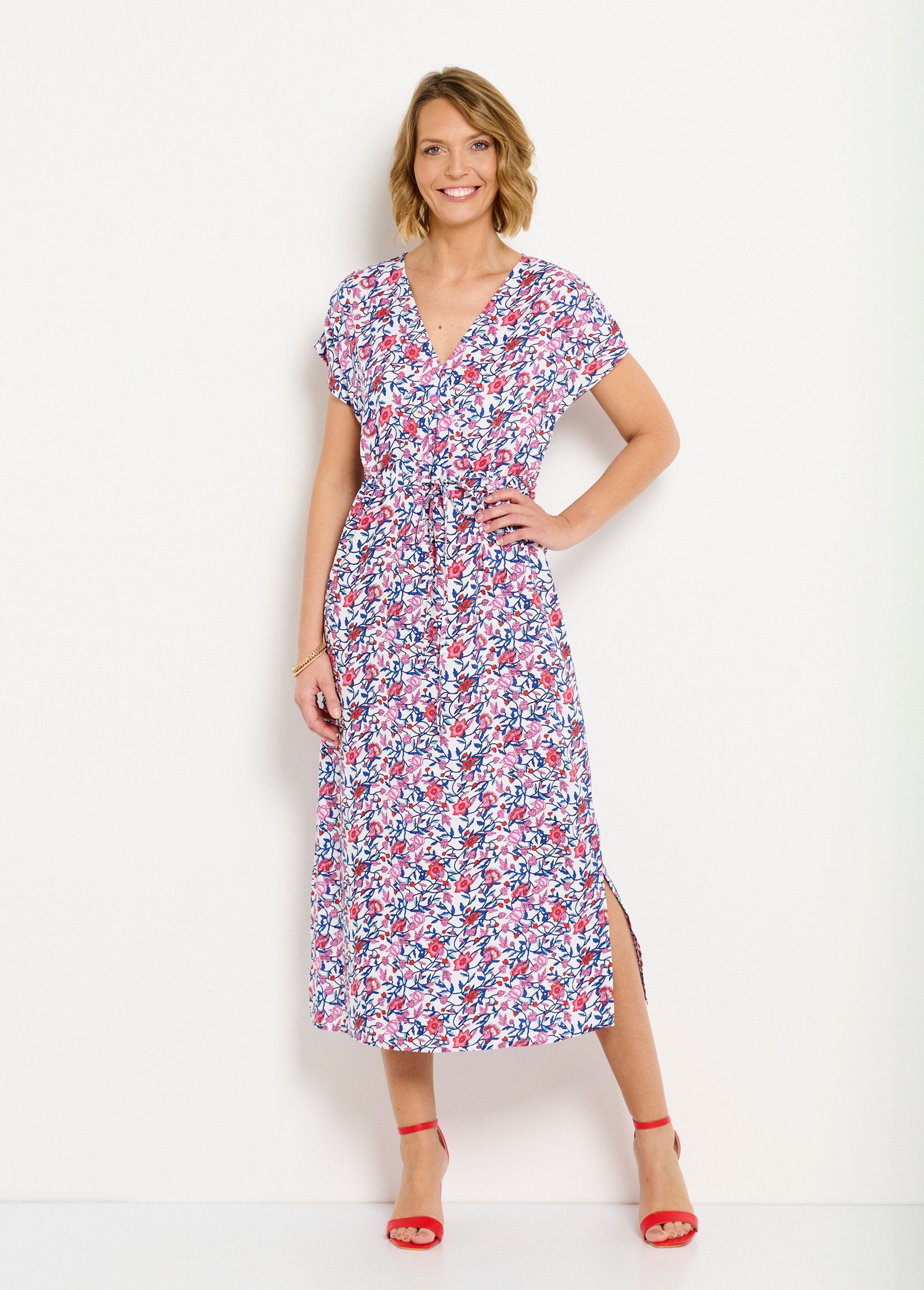 Lange, uitlopende lijnen op een zachte, vloeiende stof... Deze mooie jurk biedt ook echt comfort! De V-halslijn wordt benadrukt door plooitjes onder de schouders vooraan. De taille wordt gemarkeerd door een strikceintuur onder een trekkoord. De basis heeft een split aan de zijkanten. Korte kimono-mouwen.