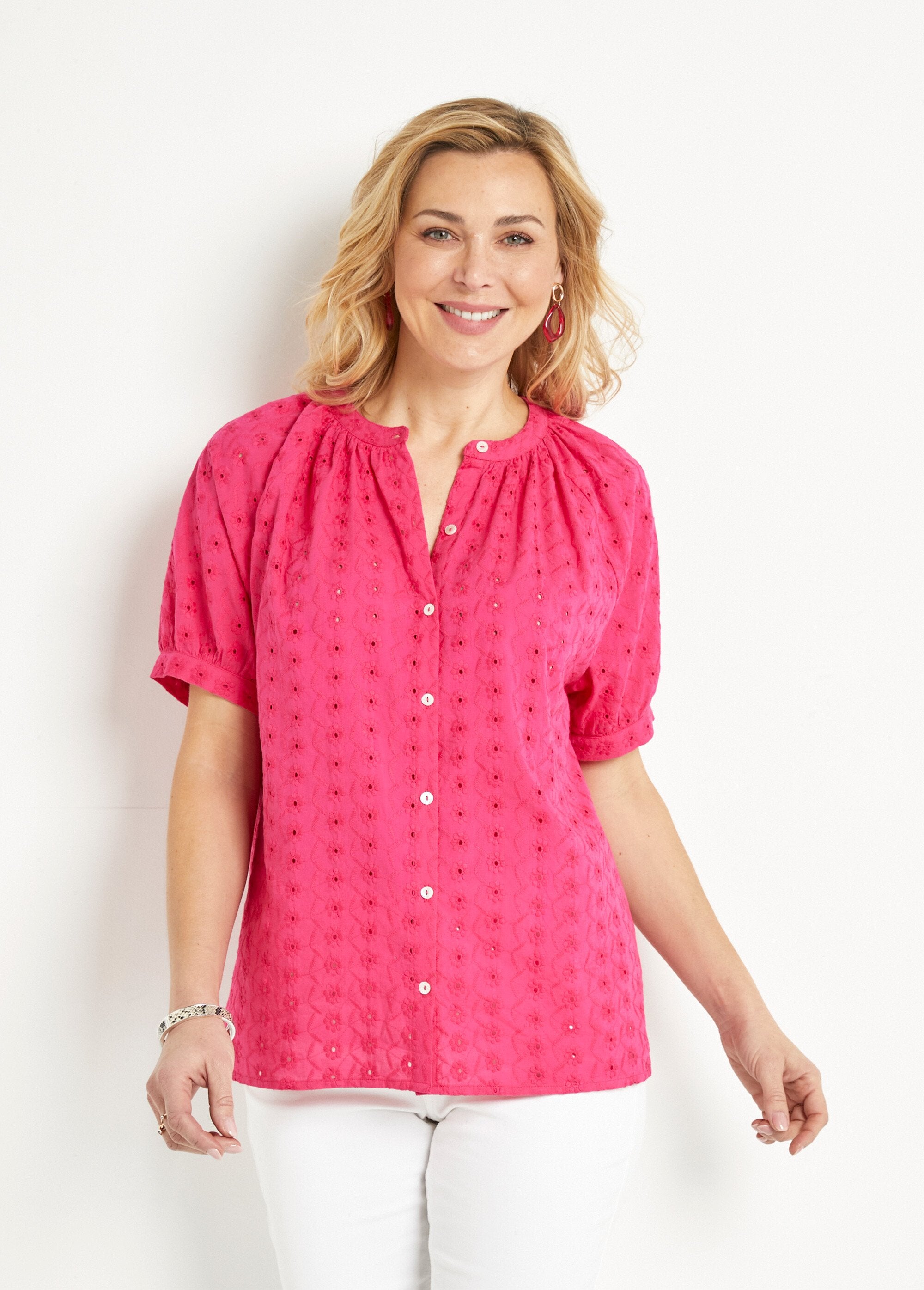 Joli volume féminin, broderies ton sur ton en total look... Le chemisier de l'été fait peau neuve. Illustration avec les détails qui font la différence : des fronces sous l'encolure ronde devant et dos pour lui donner une douce ampleur, des emmanchures raglan qui mettent en valeur le buste et une finition élastiquée au bas des manches courtes pour un volume légèrement bouffant. Patte de boutonnage. Base droite.