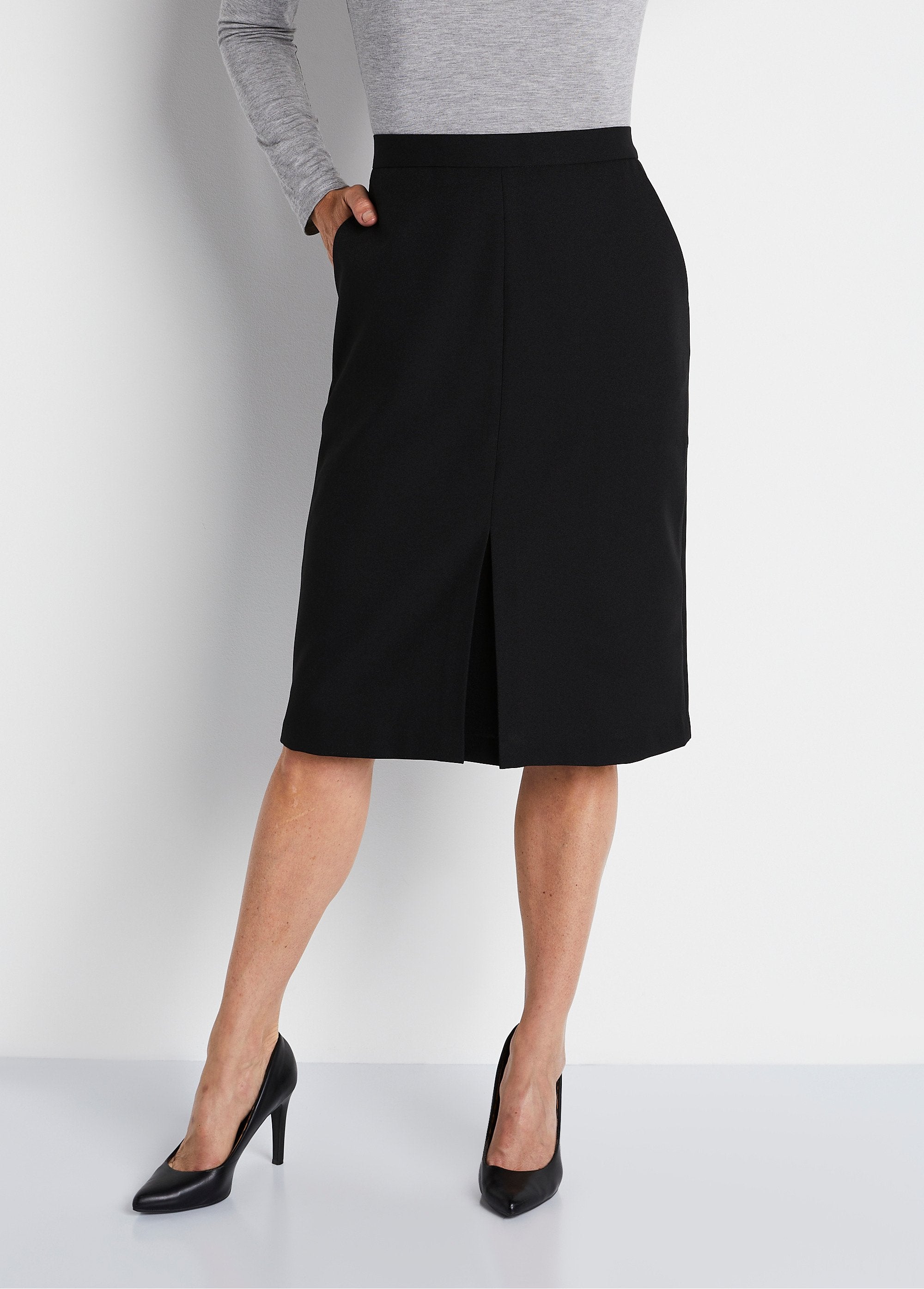 Coupée dans un confortable tissu extensible, la jupe suit vos mouvements en restant impeccable. Montée sur ceinture élastiquée côtés et dos. Pli creux milieu devant. Fermeture dos par bouton et glissière invisible. 65 cm env. Lavable 30°C. Tissu polyester infroissable.