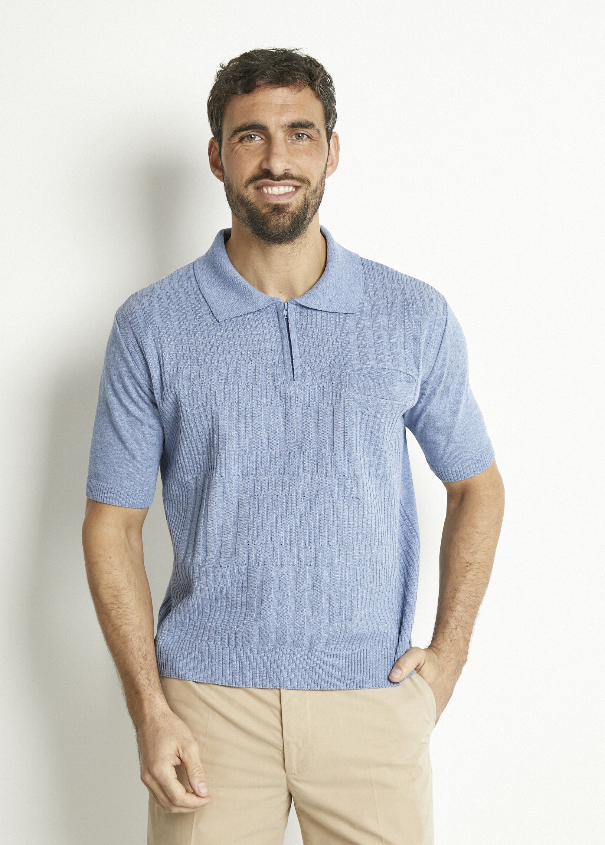 Alliance de classique et de modernité, le polo manches courtes s'offre une maille rafraîchie de coton pour garder l'allure tout l'été. Maille fantaisie et poche poitrine passepoilée devant. Col polo ouvert sur fermeture zippée. Finitions par bord-côtes.